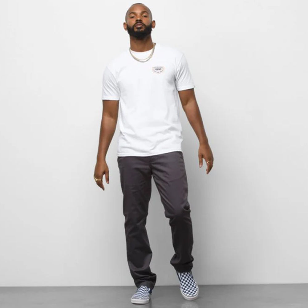 Vans Authentic Chino Pants have been a mainstay for years, and for good reason—they keep it simple, classic, and are always on point. The Authentic Chino Slim Pant is no different. Designed with a slightly low rise at the waistline, this chino pant maintains a slim fit through the hip, thigh and leg that ends in a narrow 14.5-inch leg opening for a smooth look. The mid-weight 8.3 oz twill blend offers a new and improved soft hand feel, while subtle brand details are added throughout: a V-shaped rear belt loop, “Drop-V” bar tack embroidery at the top corner of the left rear welt pocket, checkerboard twill taping inside the fly, and a branded flag label sewn into the hem of the leg opening that’s visible when cuffed. Model is 6 feet tall and wearing a size 32 x 32. Inseam is 32 inches.