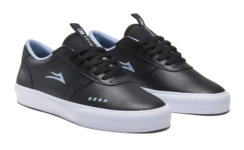 The Lakai x Fourstar Manchester is more sophisticated in a clean all black pebble leather. The branding is elevated with embroidered micro Flare on the side and Fourstar logo on the toe. Translucent light blue outsole.